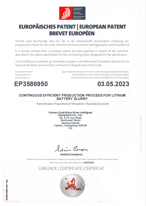 近期,由佛山市金銀河智能裝備股份有限公司申請(qǐng)的發(fā)明專利——一種鋰電池漿料連續(xù)化高效生產(chǎn)工藝,正式獲得由歐洲專利局(EPO)頒發(fā)的專利證書(shū)(專利號(hào):EP3586950)。