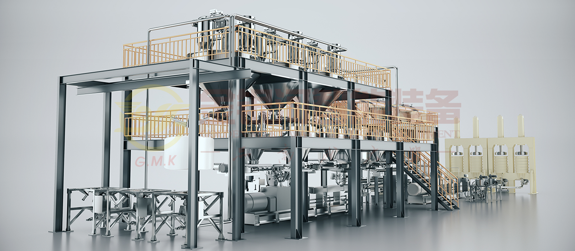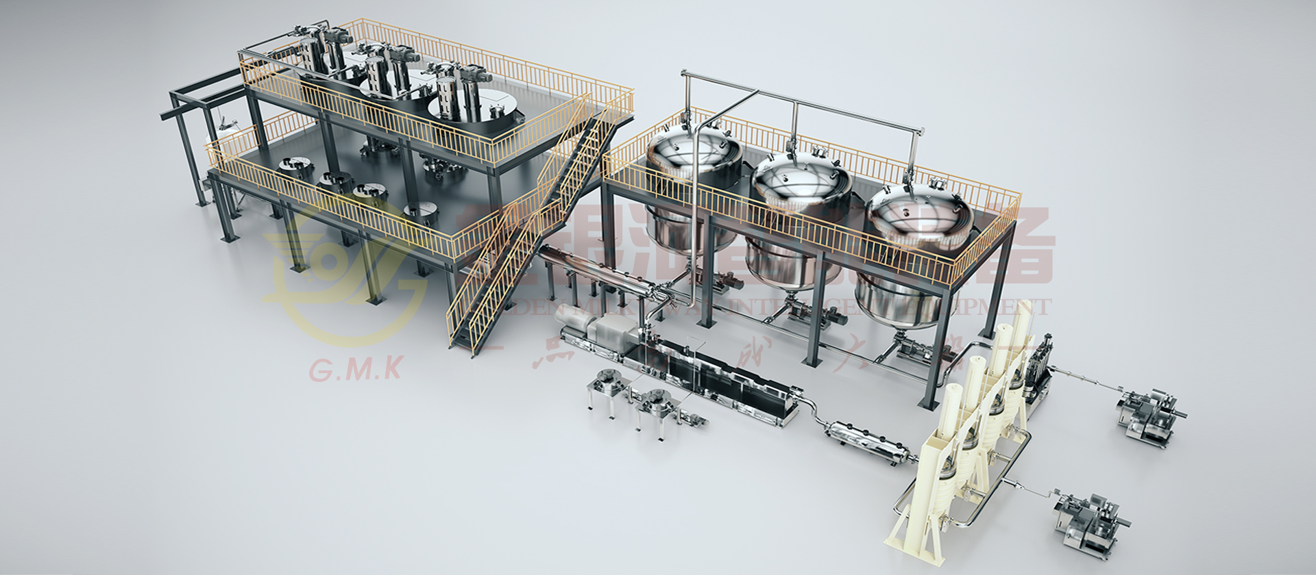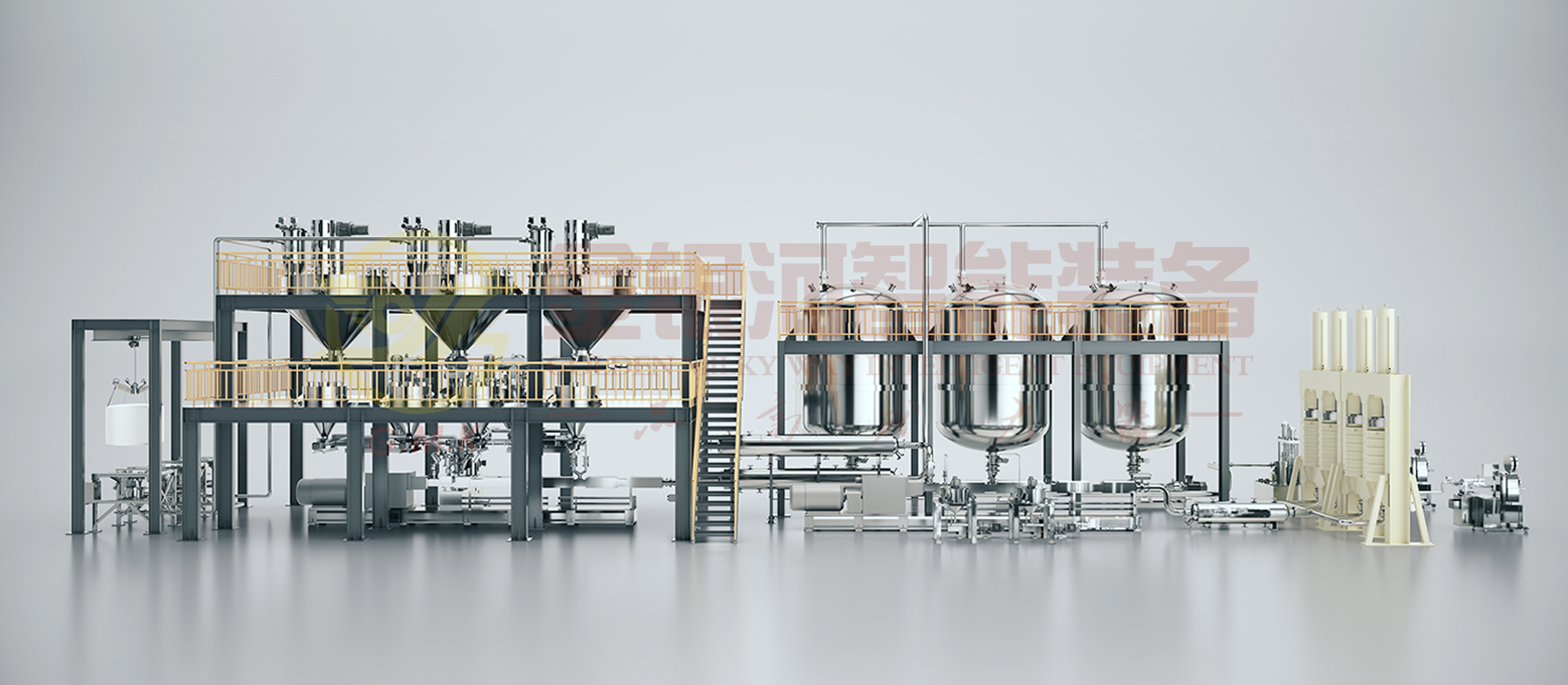 由計量斗、稱量及輸送系統(tǒng)、貯罐、冷卻器、多工位出料機、喂料機、高速預混機、雙螺桿螺旋混合機、輔助設備及DCS中央控制系統(tǒng)組成。原材料(粉體與液體)通過精確的計量系統(tǒng)在線自動和連續(xù)輸送到螺旋混合機中,利用螺旋混合機中的混合、分散、研磨、溫控、抽真空等功能滿足不同的生產(chǎn)配方工藝,對于建筑膠產(chǎn)品如:脫肟、脫醇型密封膠根據(jù)工藝需求作出多種設備調(diào)整組合,通過在線加入色漿及助劑至其中。它的生產(chǎn)效率高,適合大規(guī)模生產(chǎn);它具有自動化程度高,杜絕物料直接接觸空氣,產(chǎn)品質(zhì)量穩(wěn)定性好,物料及能源損耗少等優(yōu)點。