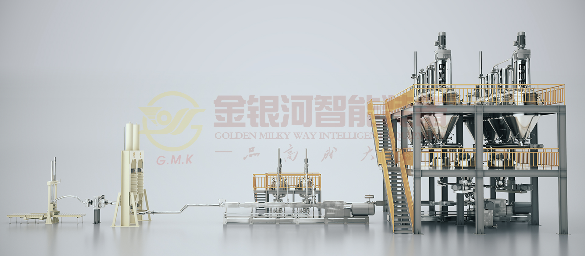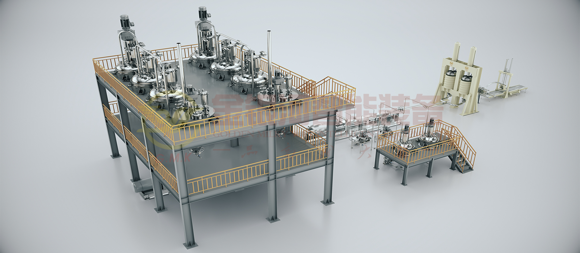 由計(jì)量斗、稱量及輸送系統(tǒng)、貯罐、冷卻器、多工位出料機(jī)、喂料機(jī)、雙螺桿螺旋混合機(jī)、在線烘干、冷卻粉體裝置、輔助設(shè)備及DCS中央控制系統(tǒng)組成。原材料(粉體與液體)通過(guò)精確的計(jì)量系統(tǒng)在線自動(dòng)和連續(xù)輸送到螺旋混合機(jī)中,在一階螺旋混合機(jī)中完成混合、分散、研磨、抽真空等產(chǎn)出基料后入二階螺旋混合機(jī),通過(guò)在線加入助劑至其中,再次完成混合、分散、研磨、抽真空等完成品料制作并輸出進(jìn)入多工位出料機(jī)暫存,多工位機(jī)出料機(jī)輪流交替出料過(guò)濾包裝。它的生產(chǎn)效率高,適合大規(guī)模生產(chǎn);它具有自動(dòng)化程度高,杜絕物料直接接觸空氣,產(chǎn)品質(zhì)量穩(wěn)定性好,物料及能源損耗少等優(yōu)點(diǎn)。
