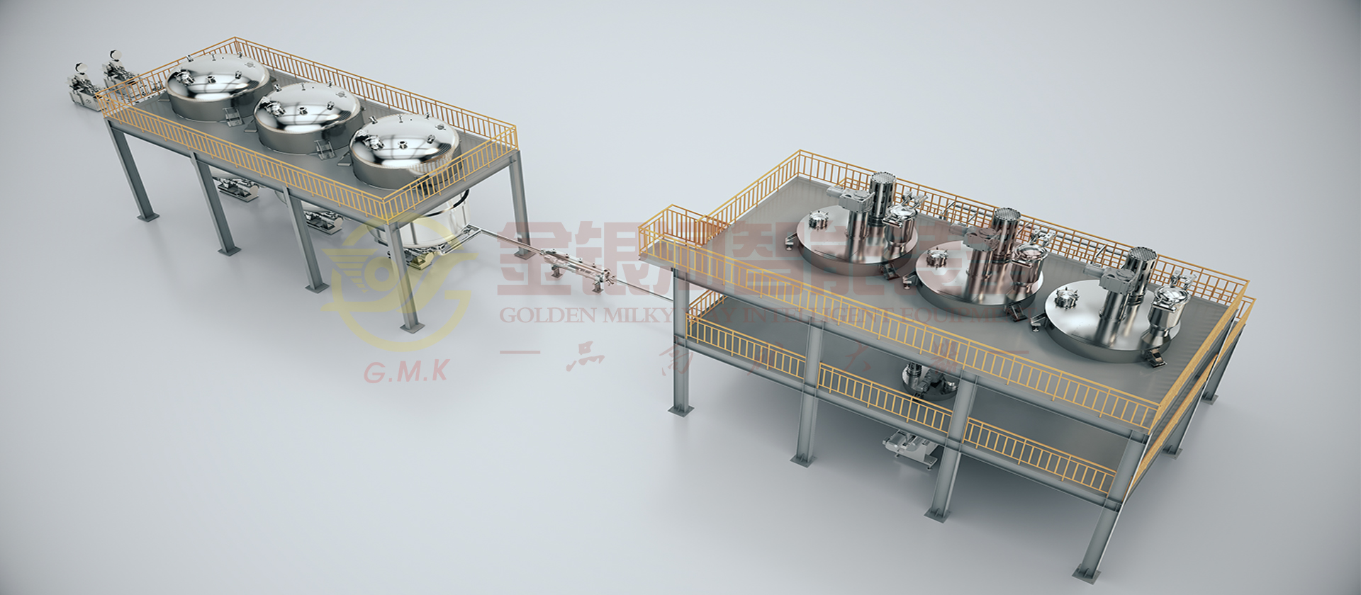 由計(jì)量斗、稱量及輸送系統(tǒng)、貯罐、冷卻器、喂料機(jī)、雙螺桿螺旋混合機(jī)、輔助設(shè)備及DCS中央控制系統(tǒng)組成。原材料(粉體與液體)通過精確的計(jì)量系統(tǒng)在線自動(dòng)和連續(xù)輸送到螺旋混合機(jī)中,在雙螺桿螺旋混合機(jī)中完成粉液完成混合、分散、研磨、抽真空,并通過在線加入液料至其中,并輸出進(jìn)入貯罐暫存,后段接靜態(tài)混合機(jī)即可完成雙組分電源灌封膠產(chǎn)品輸出。它的生產(chǎn)效率高,適合大規(guī)模生產(chǎn);它具有自動(dòng)化程度高,杜絕物料直接接觸空氣,產(chǎn)品質(zhì)量穩(wěn)定性好,物料及能源損耗少等優(yōu)點(diǎn)。