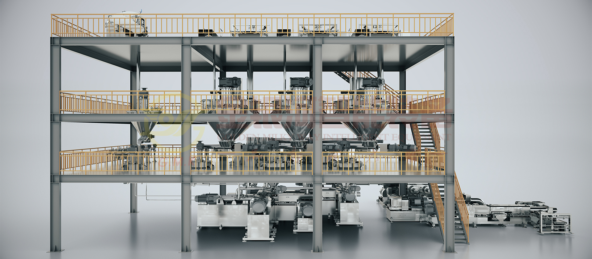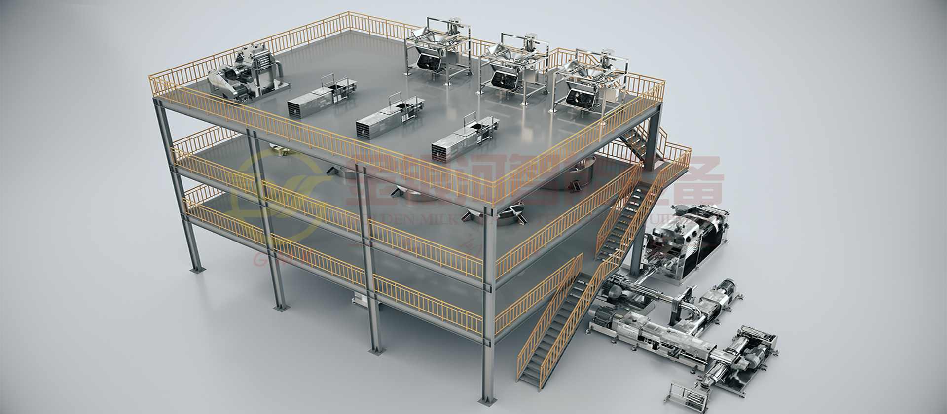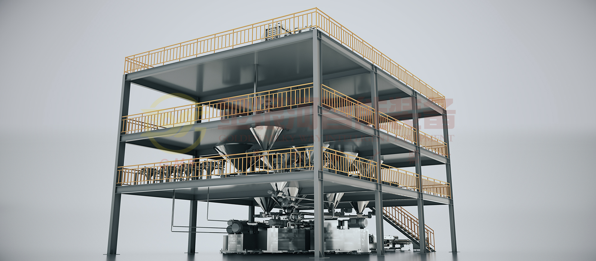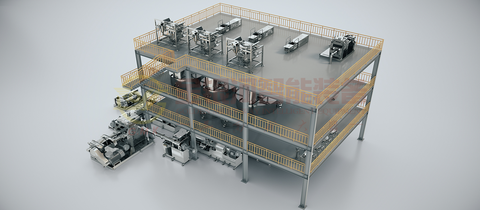 由計(jì)量斗、稱量及輸送系統(tǒng)、貯罐、生膠喂料機(jī)、單螺桿預(yù)混機(jī)、雙螺桿螺旋混合機(jī)、帶擠出功能捏合機(jī)、單螺桿輸送機(jī),網(wǎng)式過濾器、定型切膠機(jī)、輔助設(shè)備及DCS中央控制系統(tǒng)組成。高溫膠的原材料(粉體與液體)通過精確的計(jì)量系統(tǒng)在線自動(dòng)和連續(xù)輸送到螺旋混合機(jī)中,分三段完成粉液混合,對(duì)產(chǎn)能大大提高,產(chǎn)出基料后進(jìn)入捏合機(jī),抽真空的同時(shí)把料擠出到下一雙螺桿螺旋混合機(jī)進(jìn)行在線冷卻,出口按照要求的包裝出料大小定型、切斷后包裝。它的生產(chǎn)效率高,適合大規(guī)模生產(chǎn);它具有自動(dòng)化程度高,杜絕物料直接接觸空氣,產(chǎn)品質(zhì)量穩(wěn)定性好,物料及能源損耗少等優(yōu)點(diǎn)。